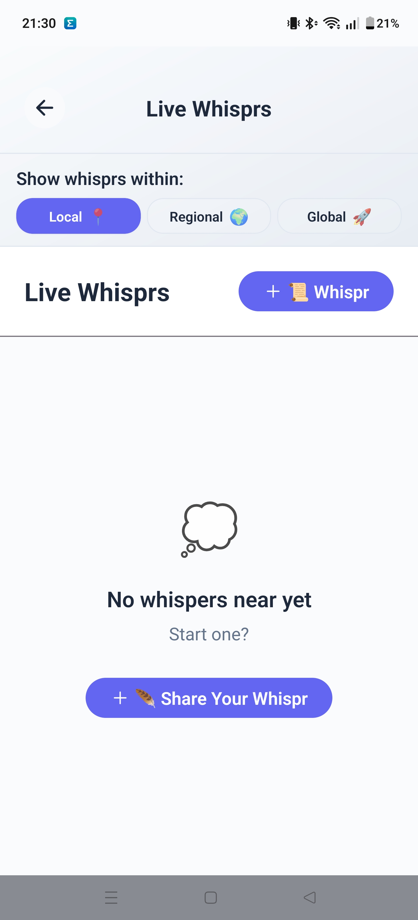 Browse live whisprs nearby or share your own note anonymously to attract connections.